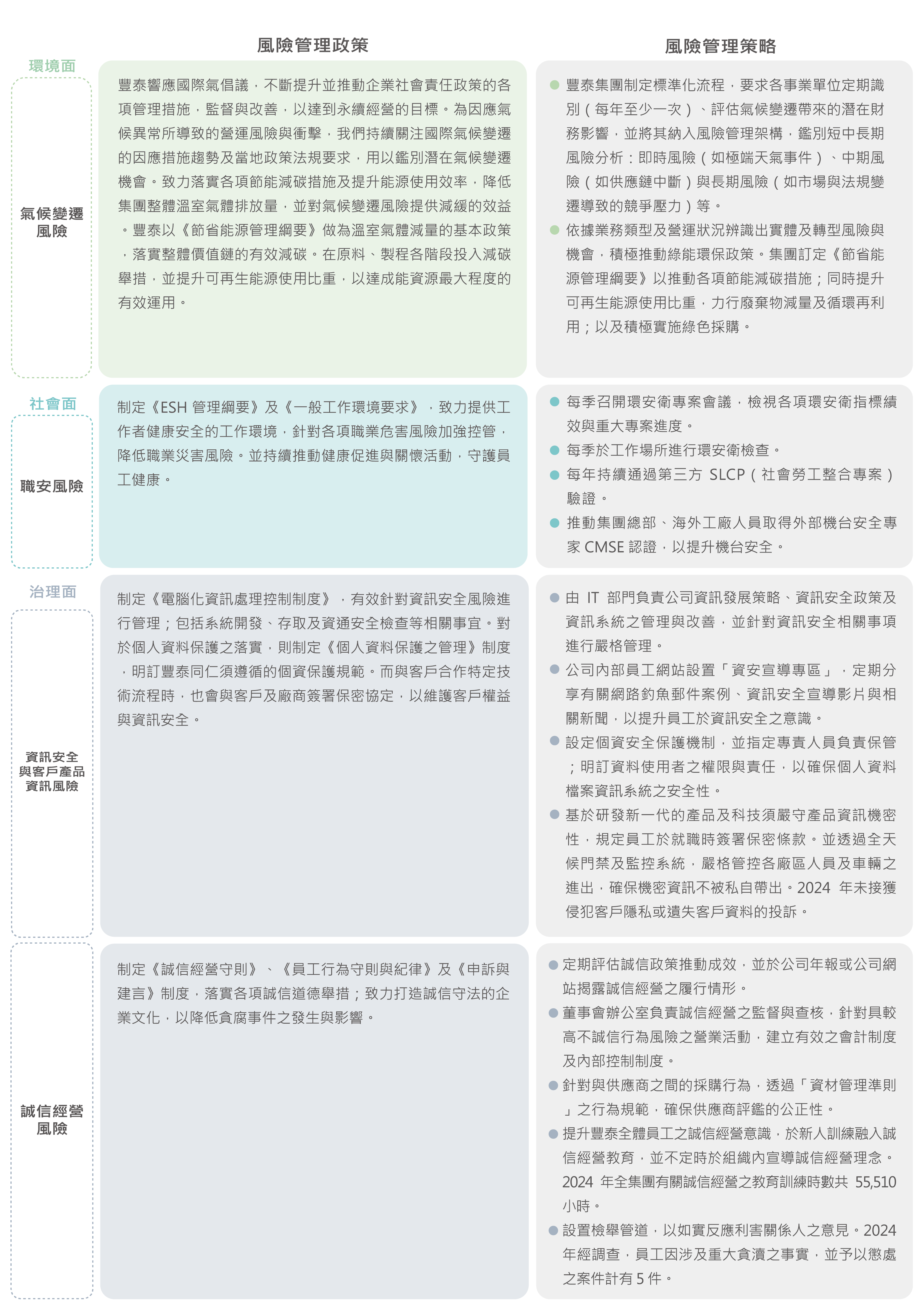 其中,永續生存長每年依重大性原則定期鑑別可能影響公司營運、財務表現或企業聲譽的重大 ESG 風險和機會,並依據評估後之風險,訂定相關風險管理政策或策略。2024 年經鑑別之主要重大風險管理政策及策略如下 :